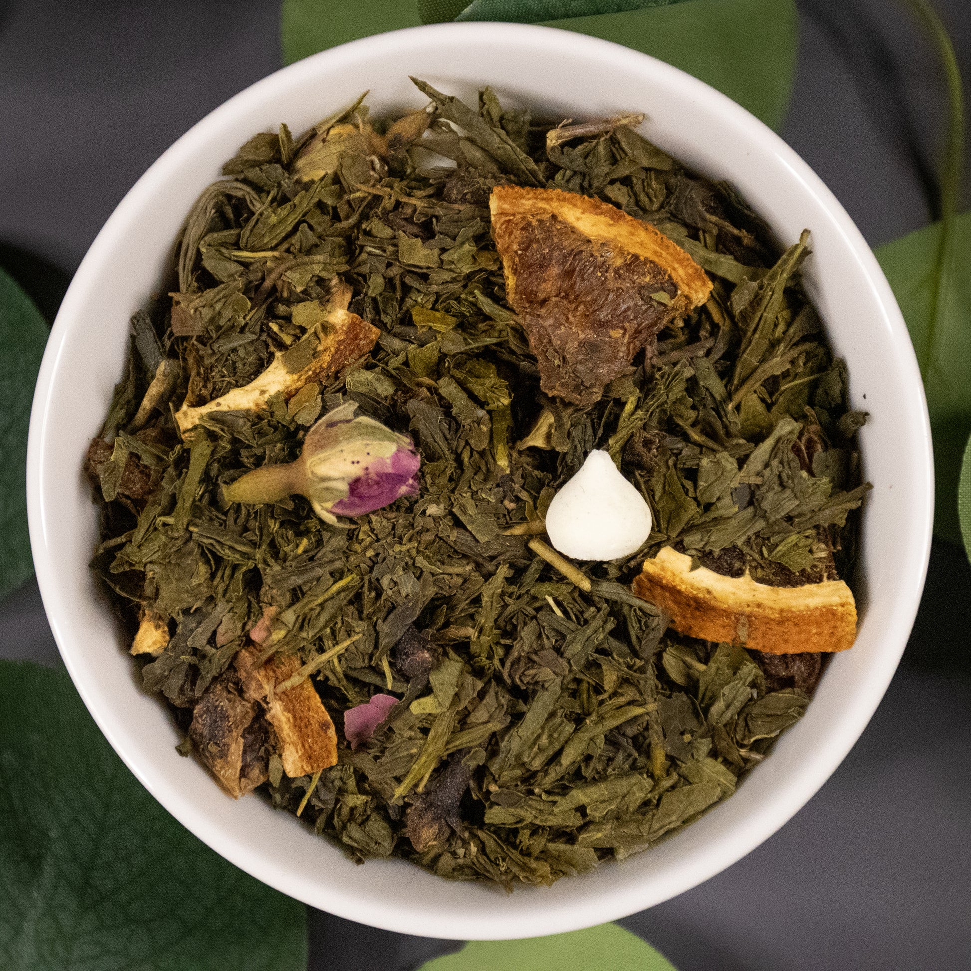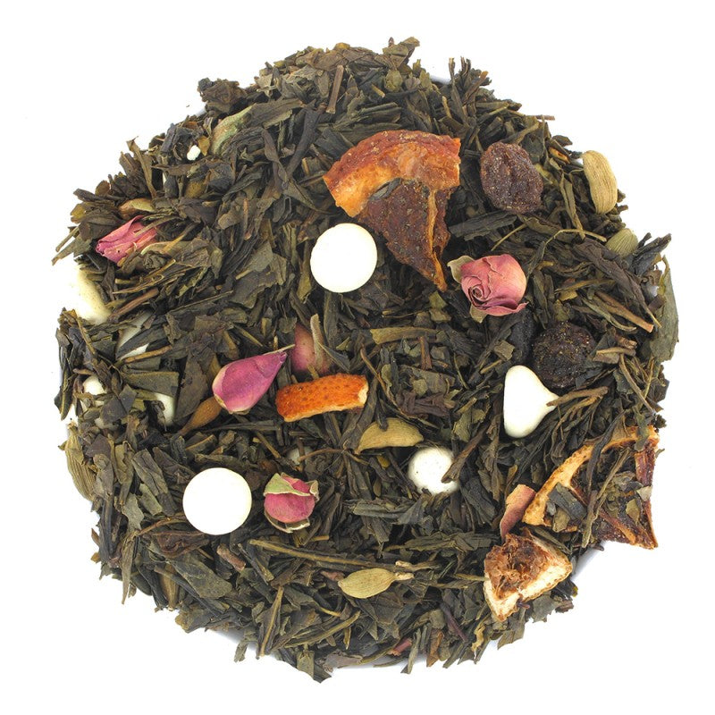 🌿 Composition : Thé vert, meringue (sucre, poudre d'oeuf), raisin sec, bouton de rose, morceaux d'orange, cardamome, clou de girofle, arôme et arôme naturel d'orange.